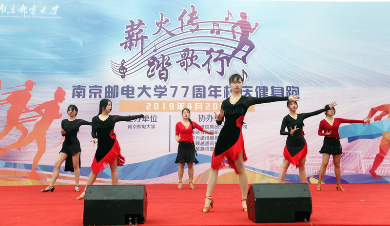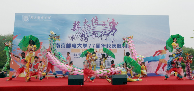 上午9时10分,参加校庆活动的师生校友齐聚仙林校区图书馆前欣赏精彩的文艺演出。临时搭建的舞台上,鼓声震天,龙腾狮跃,研究生十佳歌手带来合唱《年轻的战场》,达人瑜伽社、拉丁舞协会、柒世纪动漫社、858街舞社等社团轮番上阵,舞姿优美、节奏动感,同学们载歌载舞庆贺母校77岁生日。