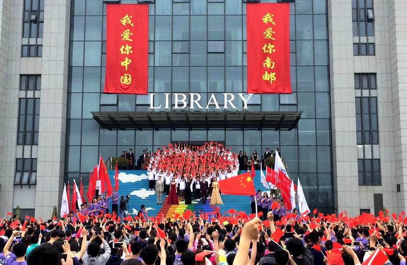 10时30分左右,“精英跑”和“接力跑”最后一站学生联队方阵在师生的欢呼声中跑进仙林校区,冲过终点线,校旗、院旗、职工旗、校友旗依次登上舞台,旗帜在旗手们的手中猎猎起舞。在仙林校区图书馆前的彩虹阶梯上,200名学生组成“心”的图形,唱响《我和我的祖国》,同学们用真挚的情感、欢乐的歌声庆祝新中国成立70周年,庆祝母校77周岁生日,“我爱你中国”“我爱你南邮”的喊声响彻整个校园,掀起校庆活动高潮。