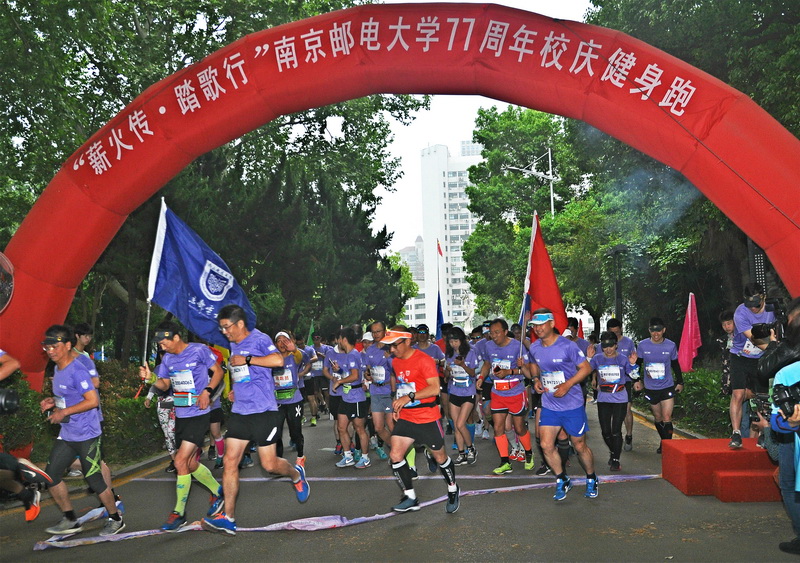 校党委书记刘陈打响“校园跑”发令枪,校领导、师生、校友以及中兴通讯、南京数族等通信行业的企业代表队约4000人一齐绕跑仙林校区校内一周,全程4.2公里,欢声笑语在校园里回响。